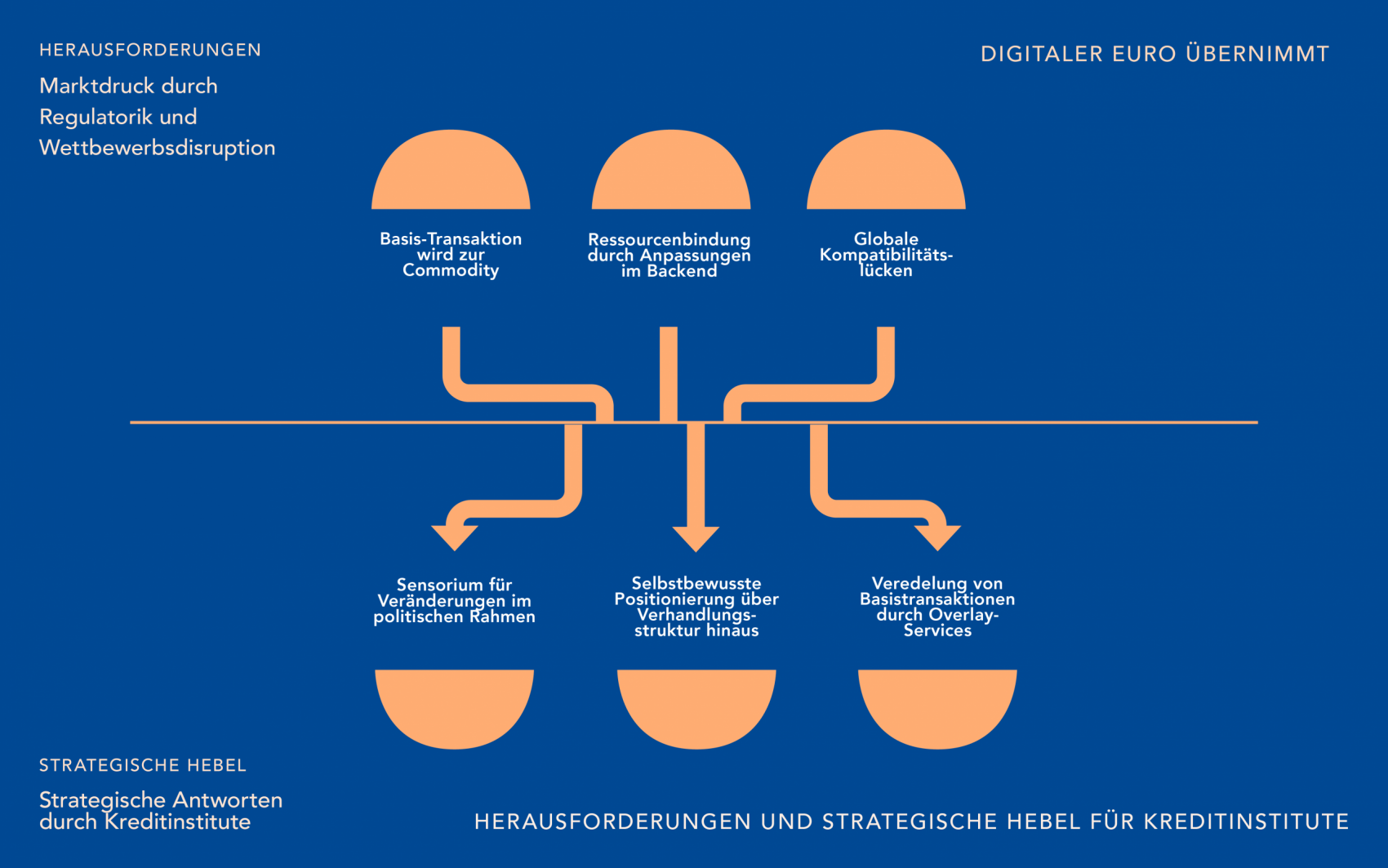 Die Einführung des digitalen Euro kann für das klassische Zahlungsverkehrsgeschäft von Kreditinstituten zur Bedrohung werden: Die Einführung einer neuen, kostenfreien Basistransaktion beeinflusst Gewinnmargen, während technische Anpassungen zusätzliche Ressourcen binden. Gleichzeitig besteht weiterhin die Notwendigkeit für globale Zahlungslösungen. Ohne klare Refinanzierungsstrategien drohen zusätzliche Kosten bei noch ungewissem Nutzen des digitalen Euro. Doch hier schlummern auch Chancen: Kreditinstitute können ihre Marktpräsenz als Hebel nutzen, um mit der EZB auf Augenhöhe zu verhandeln und sich als unverzichtbare Partner für die Einführung des digitalen Euro zu positionieren. Der gezielte Ausbau von Overlay-Services kann trotz langsamerer Innovationszyklen gegenüber Big-Techs zur Erschließung neuer Ertragsquellen führen.